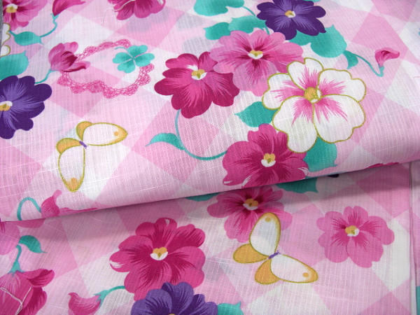 【 期間限定送料無料商品!】 ■ 商品詳細 白とピンクの斜め格子にハートにお花、とっても可愛いお子様浴衣! − 良質好評商品 − ブランド SEIKO MATSUDA の良質品! 生地は 涼感のある 良質の紅梅変り織り! 七夕 夏祭り 花火 お遊戯会の踊りに! お買い得な 帯付きセット もご覧下さい! 浴衣帯 下駄 巾着もご覧下さい! 女の子浴衣 他にもたくさん出品しています!ページ左のカテゴリの 女児浴衣 をご覧下さい!売り切れの場合はお問い合わせ下さい! 子供浴衣 浴衣帯 兵児帯 七歳四ッ身着物 三歳被布セット 被布コート 結び帯 箱迫セット草履 こっぽり 下駄 巾着 バック 帯締め 帯揚げ 志古貴 髪飾り かんざし 刺繍半衿肌着 足袋 お子様インナー 男児袴 雪駄 お子様用品 他にもたくさん出品しています! 【 素材 図案 配色 三拍子そろった良質品です!】 − お仕立て上がり品 − 素 材 綿100% 紅梅変り織り サイズ 身丈 約100cm 裄 約50cm 袖丈 約50cm (メーカー表示寸法) 身長 95cm〜105cm の女の子に! (体格によって異なる場合がございます) ※ 正規品です、今回特別仕入れにてこの価格での出品です! ■ ご注意 ご購入は購入後弊社営業日3日以内に連絡がとれ一週間以内にご入金可能な方にお願いします。