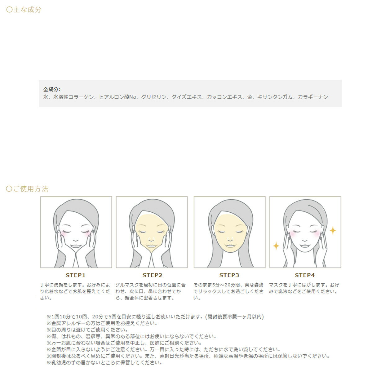 ブランド名 / 商品名 KINKA 金華ゴールド / 金華24K ゴールドアクアゲルマスク 内容量 1枚入り サイズ 全顔用 原材料 水、水溶性コラーゲン、ヒアルロン酸Na、グリセリン、ダイズエキス、カッコンエキス、金、キサンタンガム、カラギーナン ご注意 ※金属アレルギーの方はご使用をお控えください。