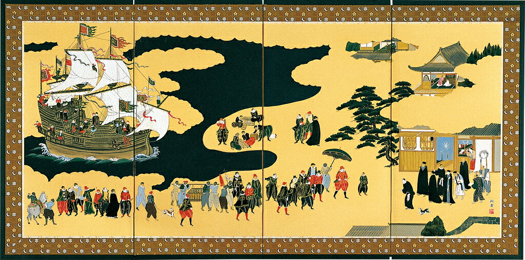 三尺四曲屏風南蛮(松井 翔雲)【※受注生産商品】【全国送料無料無料 代引き手数料無料】【屏風(びょうぶ) 間仕切り(パーテーション) 和家具】【美術品 工芸品 南蛮図屏風】